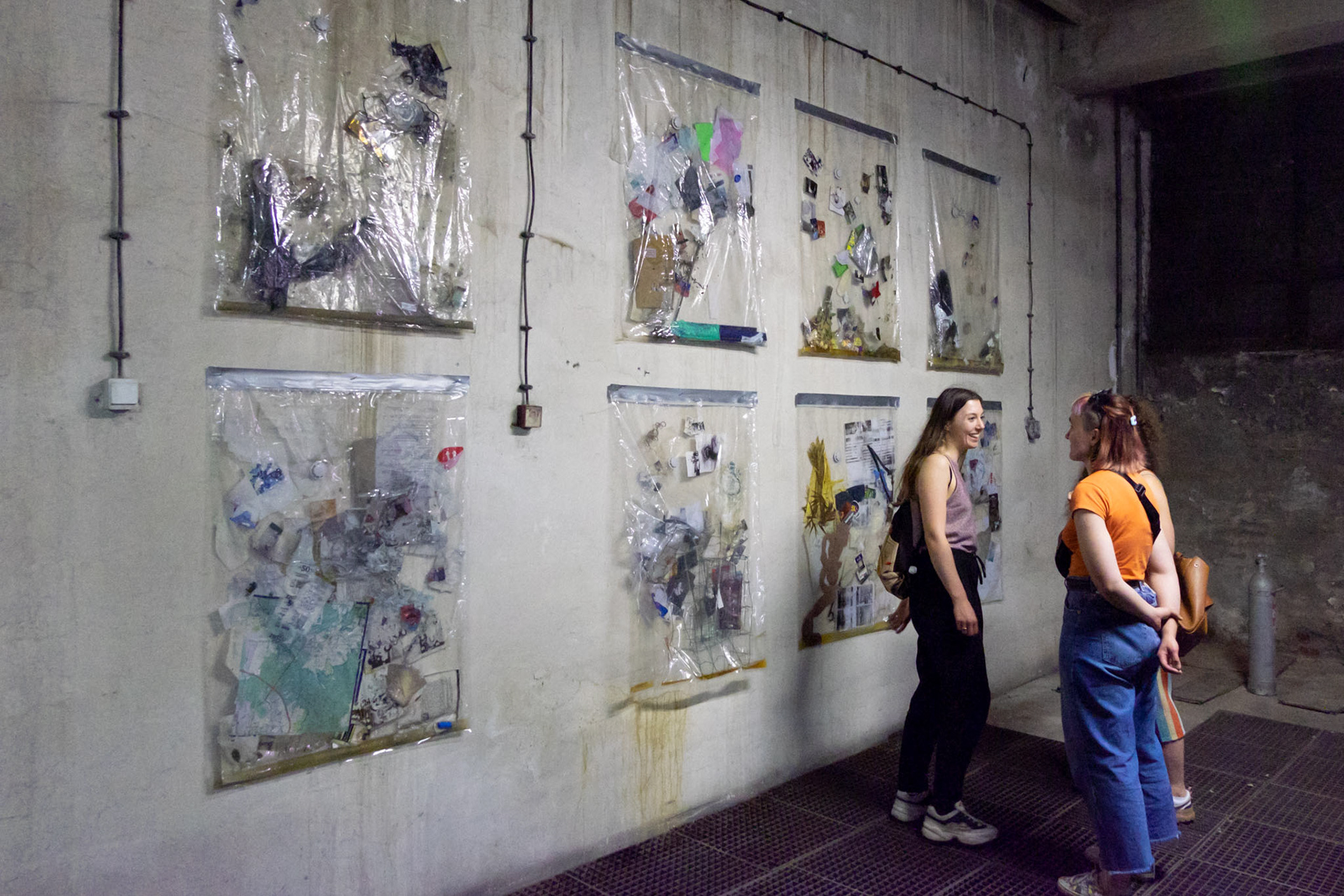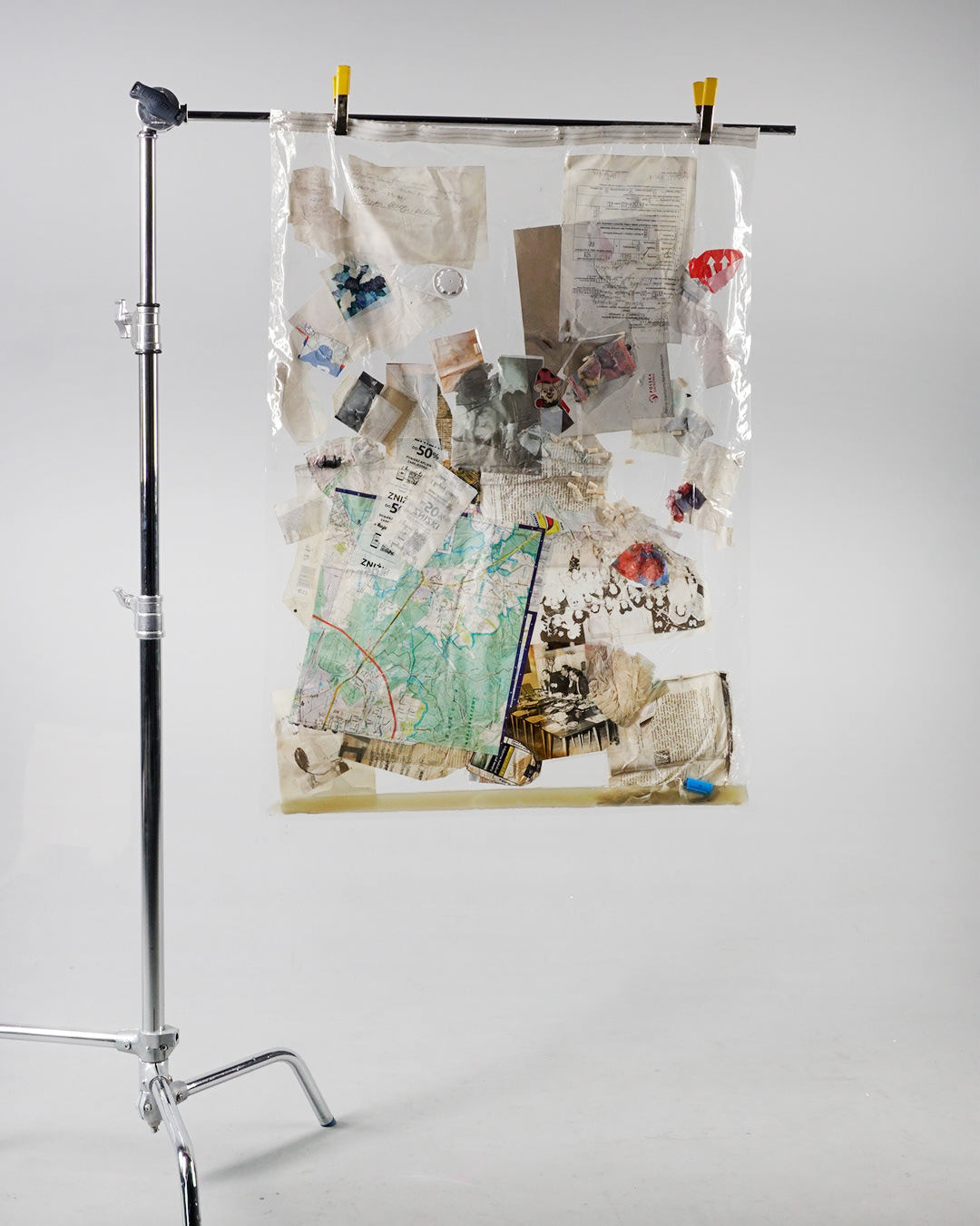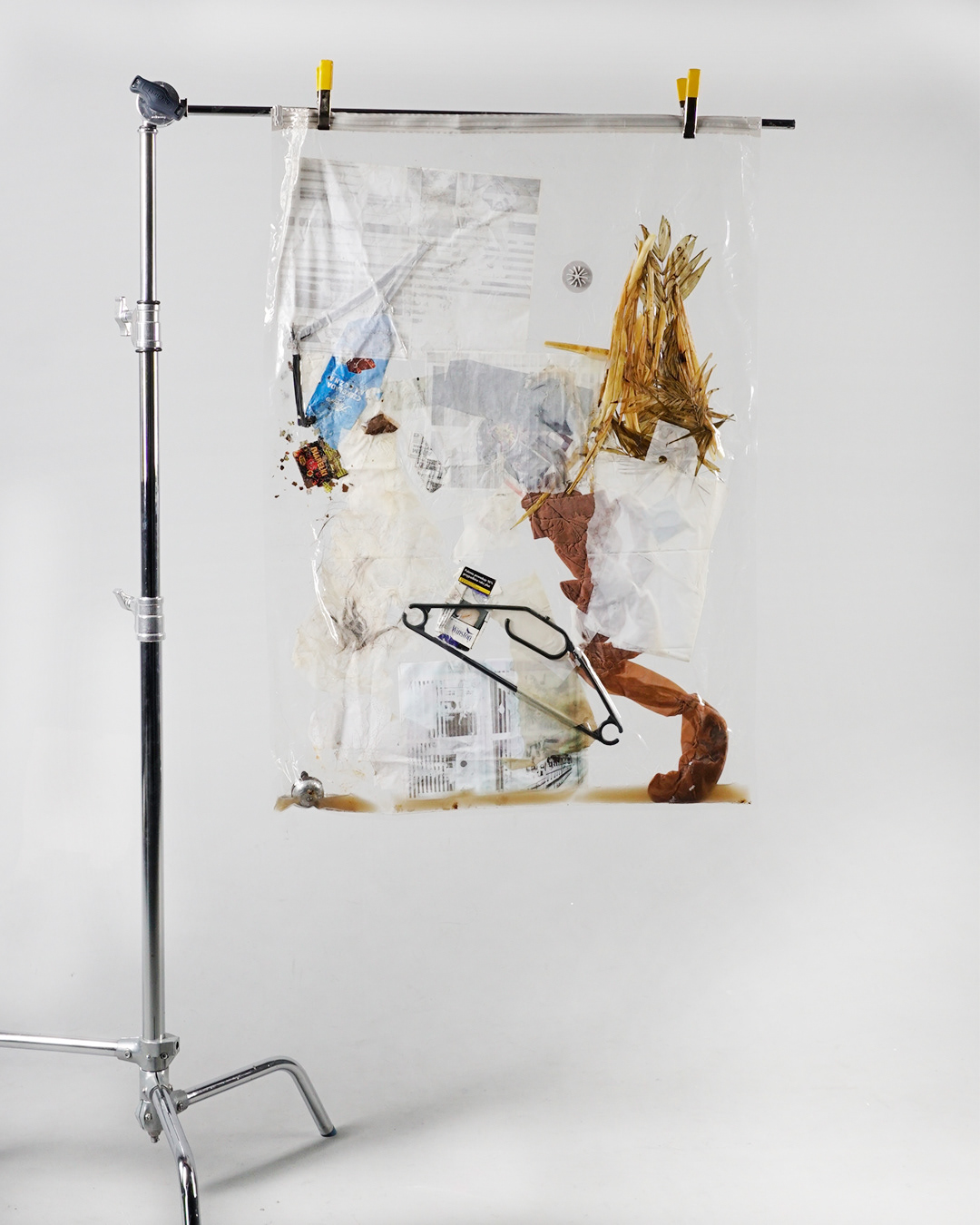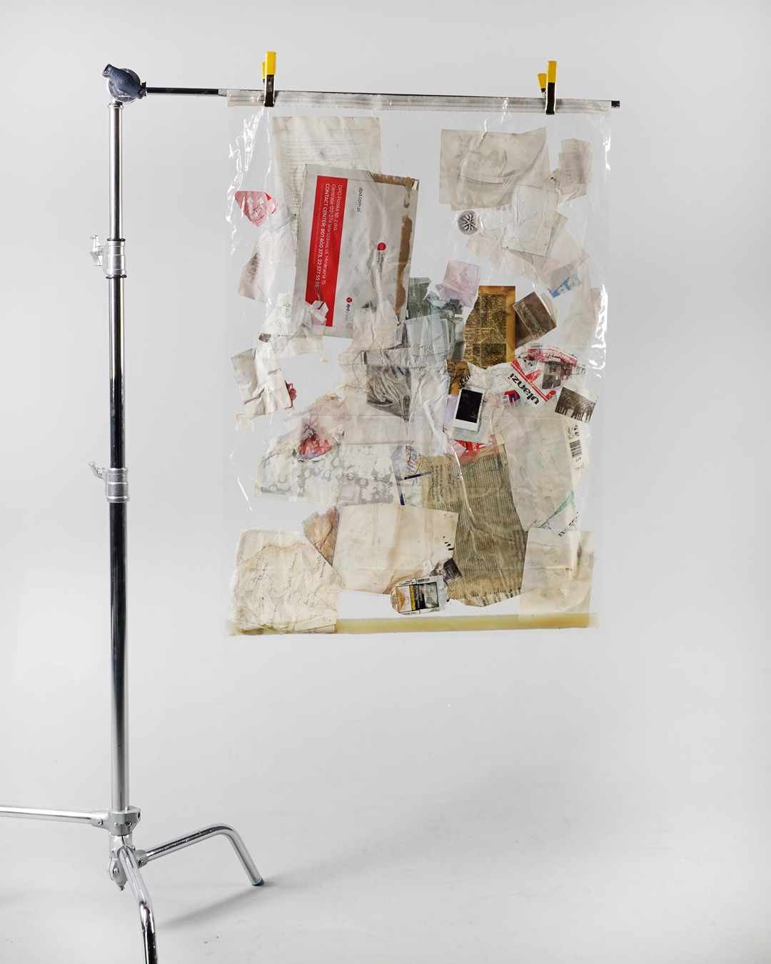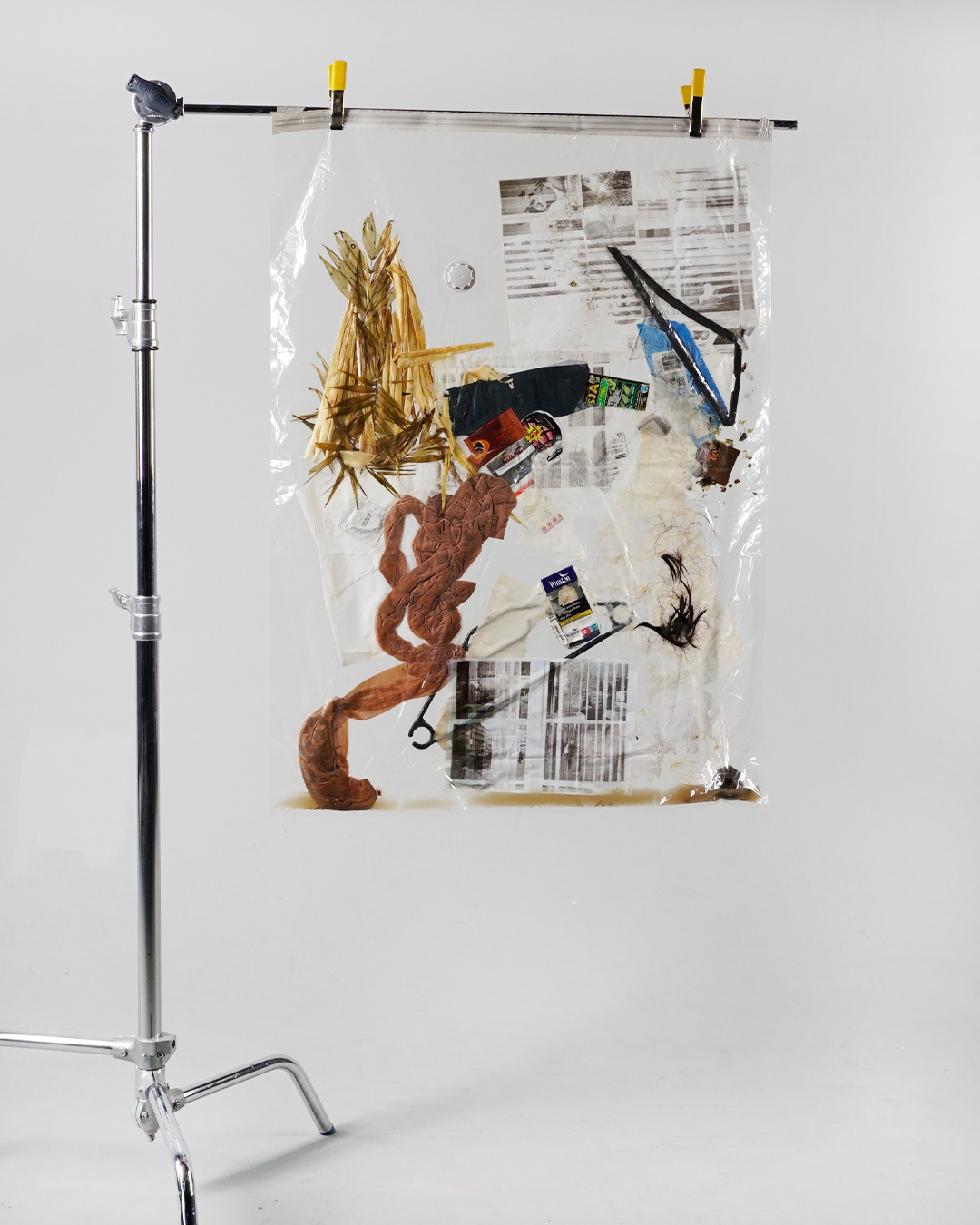 Simultaneously, I collect trash from local dumpsters and public places. I select items that contain information, such as documents, rotting food, hair, discarded lives, and broken elements.